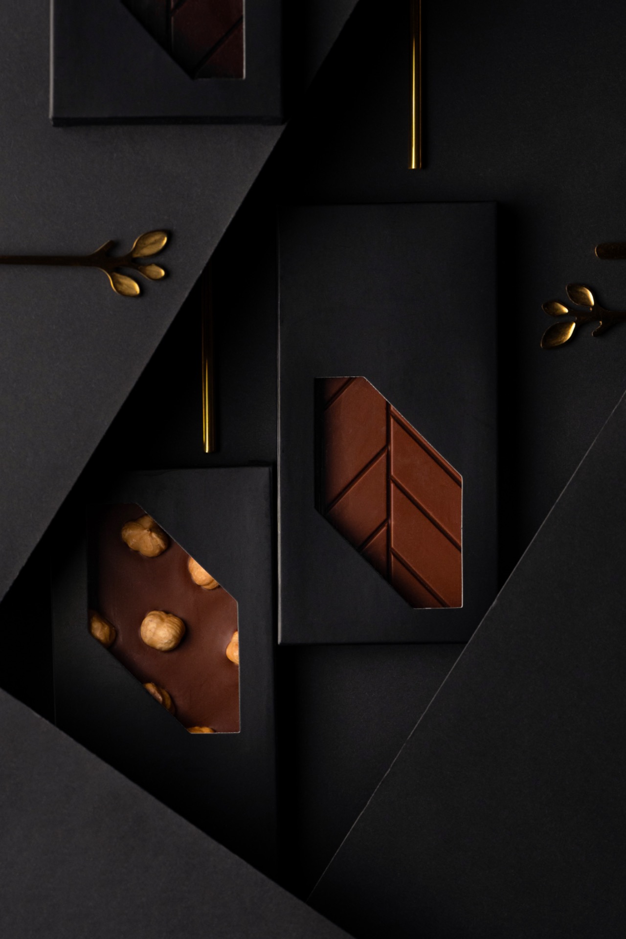 A színek kiválasztása szintén fontos, mivel a csokoládé sötét színű, ezért egy világos háttér segíthet abban, hogy kiemelkedjen. Természetesen fehércsokoládé esetében fordítva igaz. Viszont vannak olyan esetek, ahogy az alsó képeken is láthatod, hogy pont a sötét háttér miatt lesz a kép igazán magával ragadó. Itt persze kell játszani a fényekkel, és az utómunka során is a csokoládé kiemelése kulcsfontosságú.